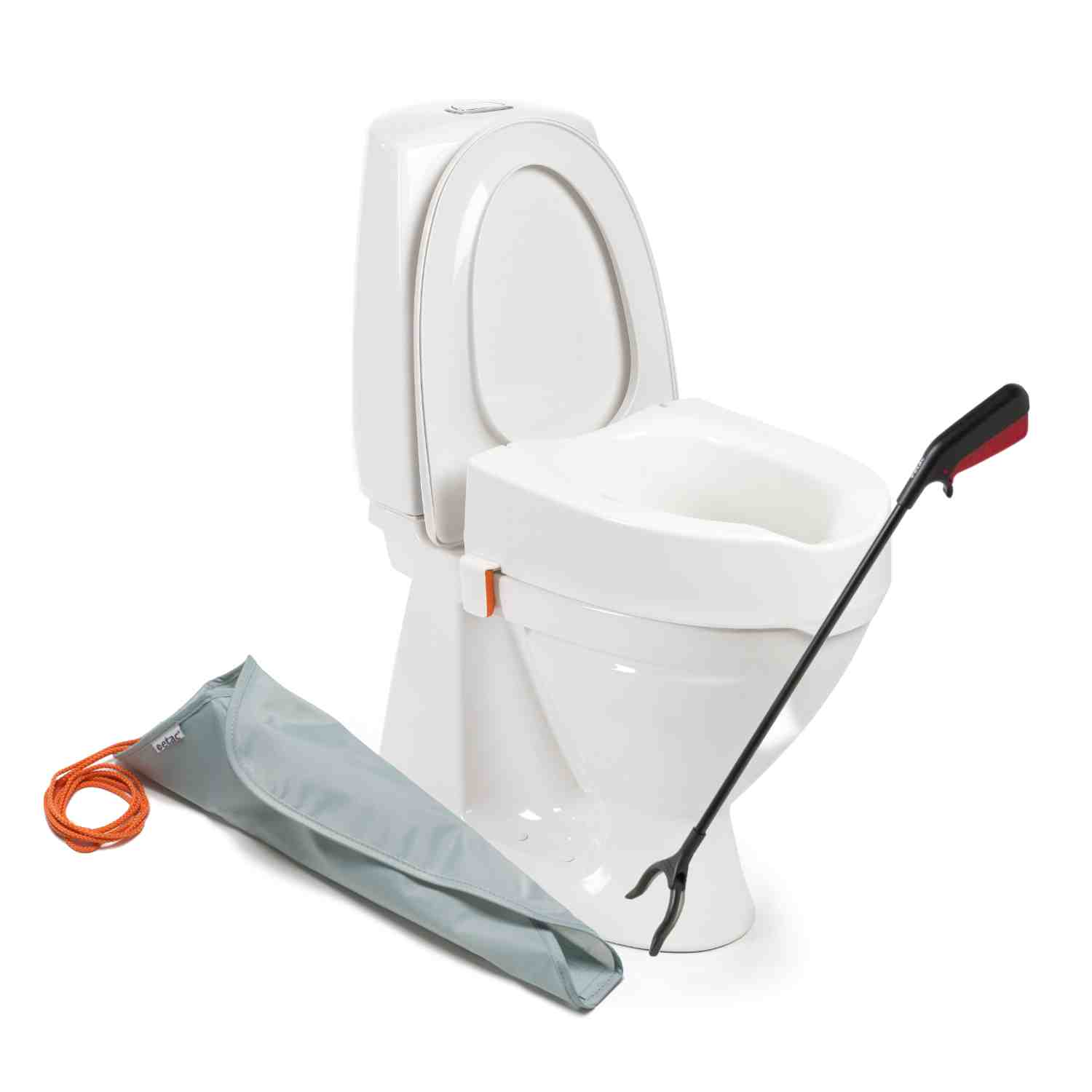 Dieses Klinik-Entlassungs-Set enthält eine Toilettensitzerhöhung, eine stabile Greifzange mit eingebauten Magneten, sowie eine praktische Sockenanziehhilfe.
