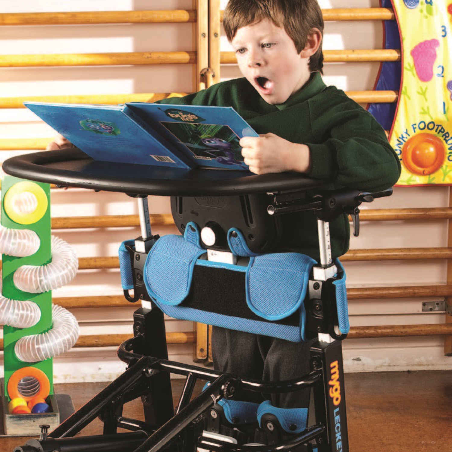 Der Mygo Stehständer ist in zwei Größen und vier verschiedenen Farben erhältlich und eignet sich für Kinder und Jugendliche von vier bis vierzehn Jahren, mit Kontrakturen bis zu 25 Grad.
