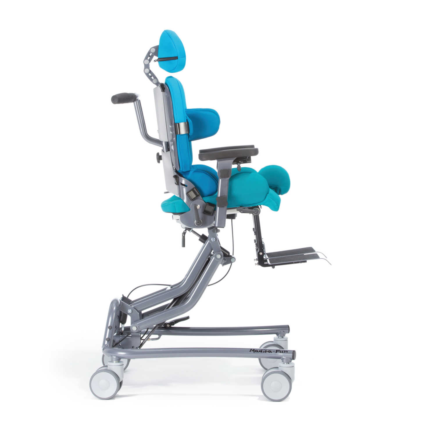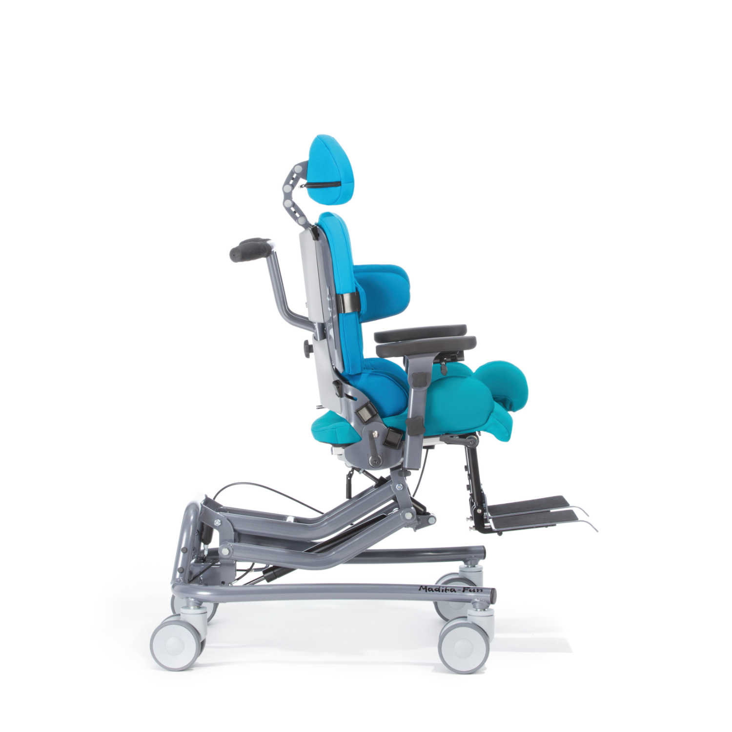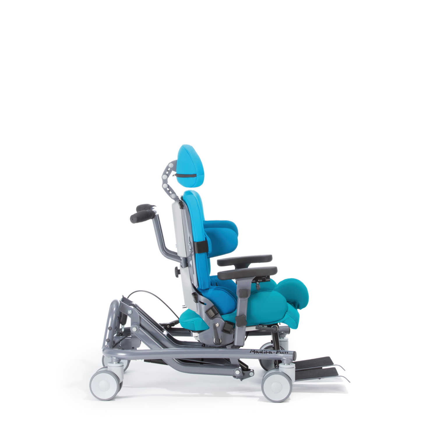 MADITA lässt sich bei Bedarf mit leichter Vorneigung einstellen und erleichtert so Aktivitäten und fördert eine Aktivierung der Rückenmuskulatur. Für Entspannungsphasen kann der Therapiestuhl in Rücklage eingestellt werden. Basierend auf dem Therapiestuhl MADITA sind Sonderbauten möglich, wie zum Beispiel das Einarbeiten individueller Körperabdrücke.